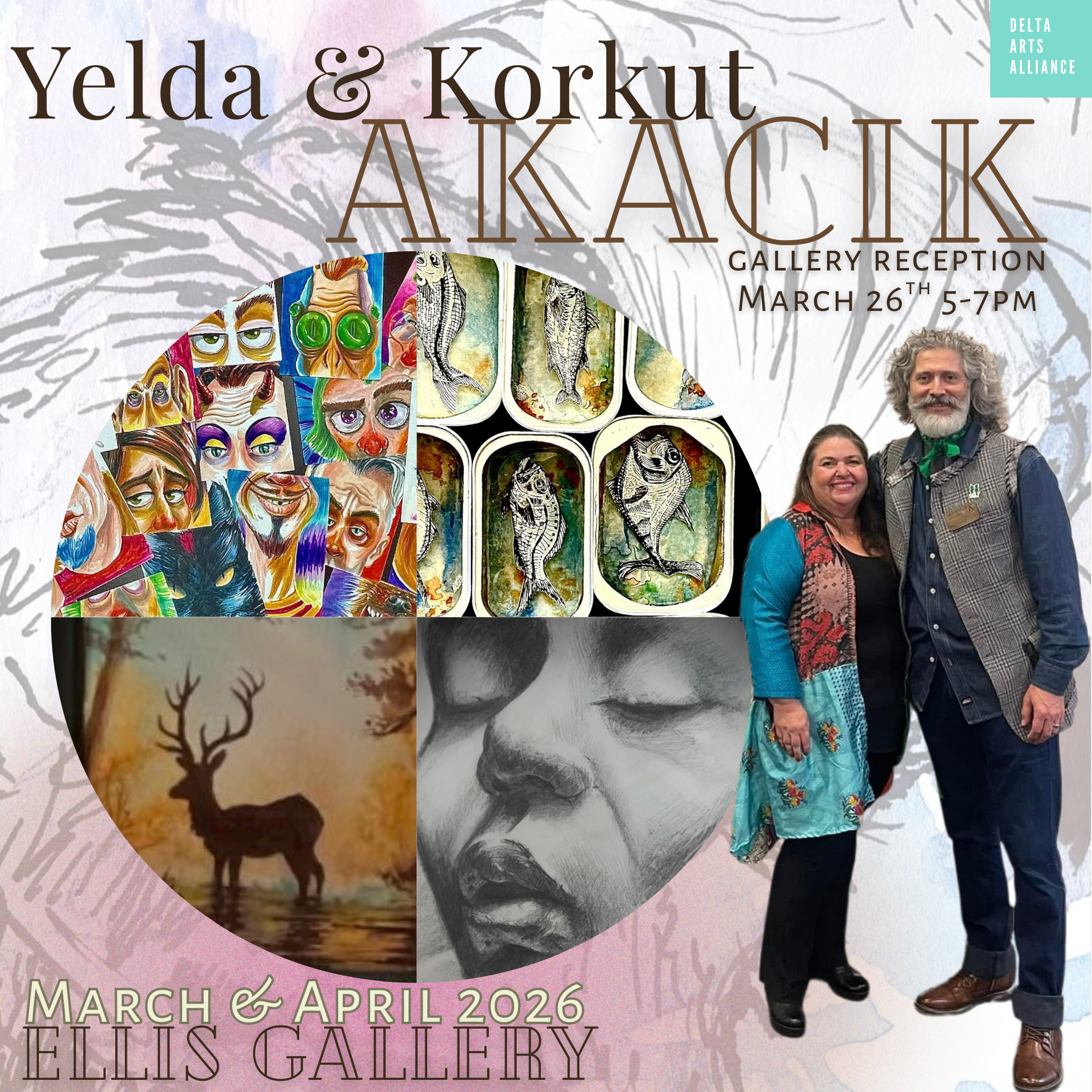 Delta Arts Alliance is pleased to present an exhibition featuring artists Yelda and Korkut Akacik. An opening reception will be held on Thursday, March 26, from 5:00–7:00 PM. The public is invited to attend and meet the artists while experiencing their work in the gallery.
