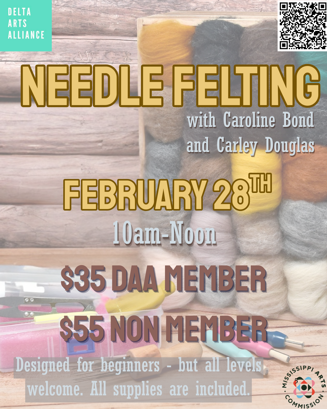 Learn the basics of needle felting in this hands-on, beginner-friendly class. Students will use wool roving and specialized needles to sculpt and shape small felted forms while learning safe tool use and core techniques. This class focuses on creative exploration and building confidence with fiber art. All essential supplies are included. No prior experience is necessary. -